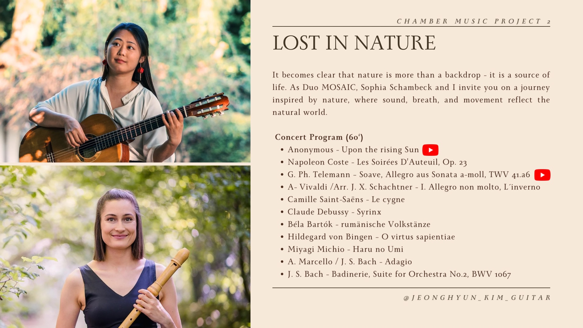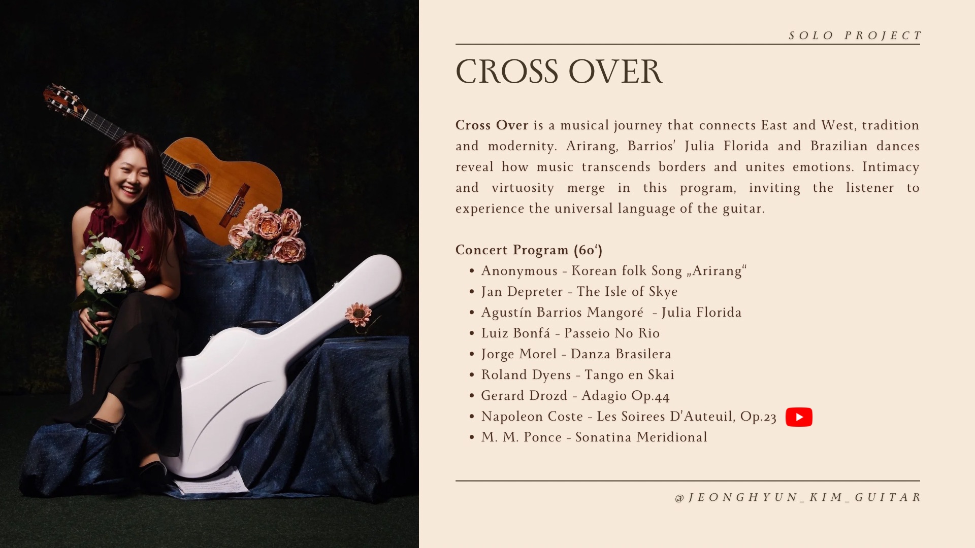Jeonghyun Kim, geboren in Seoul, zählt zu den vielversprechenden Vertreterinnen der jungen Generation klassischer Gitarristinnen. In ihrer Heimatstadt absolvierte sie erfolgreich den Bachelor of Arts im Hauptfach Gitarre an der Korea National University of Arts. In Deutschland schloss sie ihr Studium bei Prof. Franz Halász an der Hochschule für Musik und Theater München mit dem Master of Music ab. Anschließend absolvierte sie den Postgraduate Universitätslehrgang bei Prof. Laura Young an der Universität Mozarteum Salzburg.