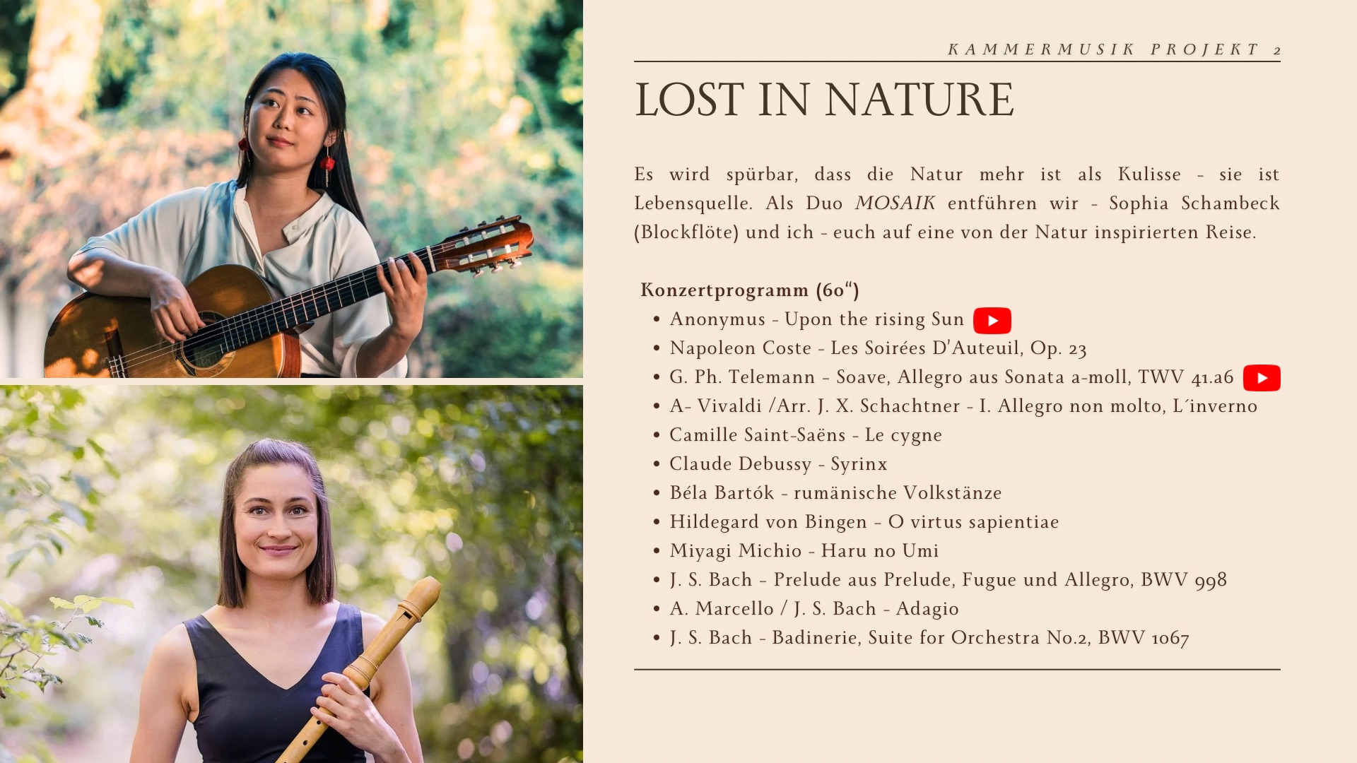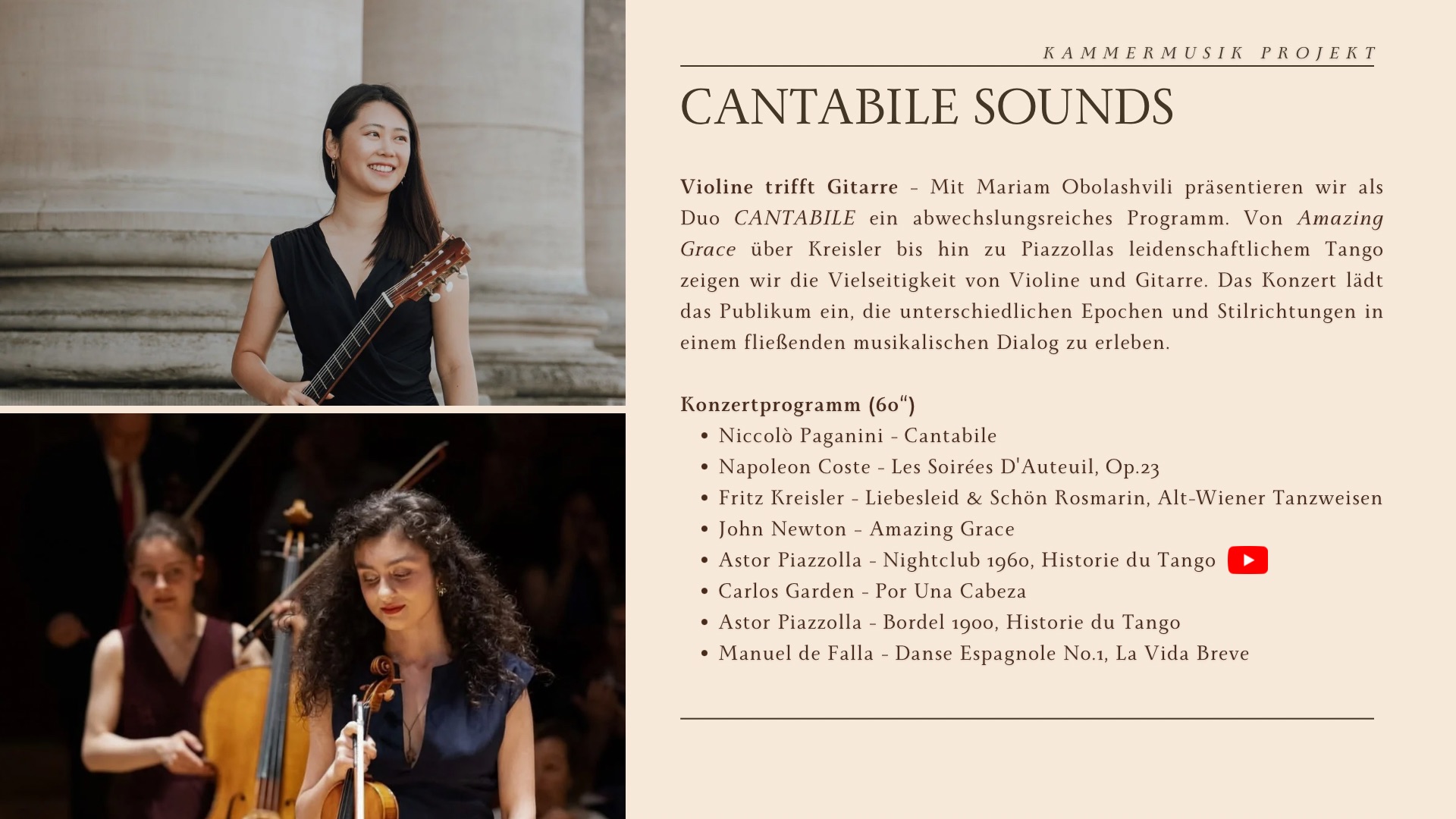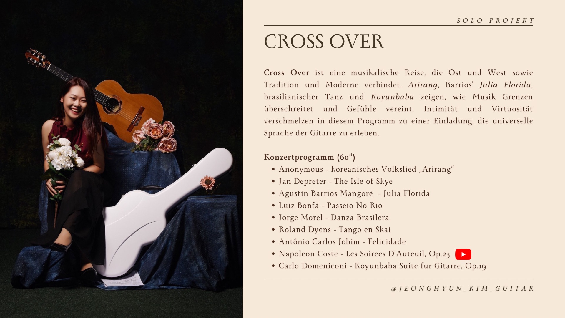 Die Musik der koreanischen Gitarristin Jeonghyun Kim ist regelmäßig in Konzerten zu hören – sowohl solistisch als auch in verschiedenen kammermusikalischen Besetzungen. Neben der klassischen Sololiteratur interpretiert Jeonghyun auch koreanische Lieder. Ein besonderer Schwerpunkt ihres Schaffens liegt auf der Kammermusik, für die sie sich durch eigene Arrangements und vielfältige Ensembleformen kontinuierlich neues Repertoire erschließt. Neben ihrer Konzerttätigkeit nimmt Jeonghyun regelmäßig an Festivals und Meisterkursen teil, um ihre künstlerischen Fähigkeiten weiter zu vertiefen. Zu ihren bisherigen Auftritten zählen unter anderem Konzerte in der Alten Pinakothek und im Neuen Rathaus in München sowie ein Kammermusikkonzert beim Musikfestival Internale. Darüber hinaus wirkte sie an mehreren Uraufführungen moderner Kompositionen mit. So brachte sie Werke von Yesul Kim, Víctor Pantoja Figueroa und Stefan Franz Huber zur Uraufführung, darunter auch ein ihr gewidmetes Stück. Jeonghyun lebt derzeit in München und organisiert verschiedene Konzerte, darunter Soloperformances und Kammermusikprogramme.